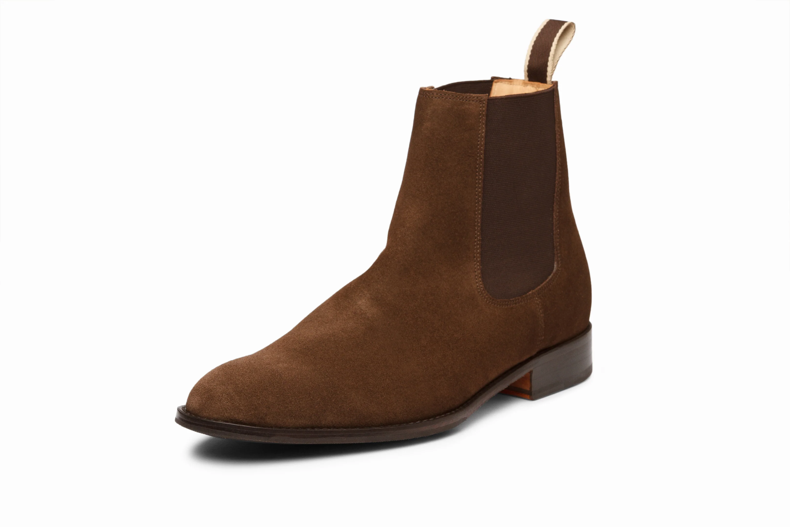 Leather Chelsea Boot features Hand Built Argentinean Leather Sole with Rubber Forepart, Dark Brown Suede Leather, and Rich Tan DD Lining.