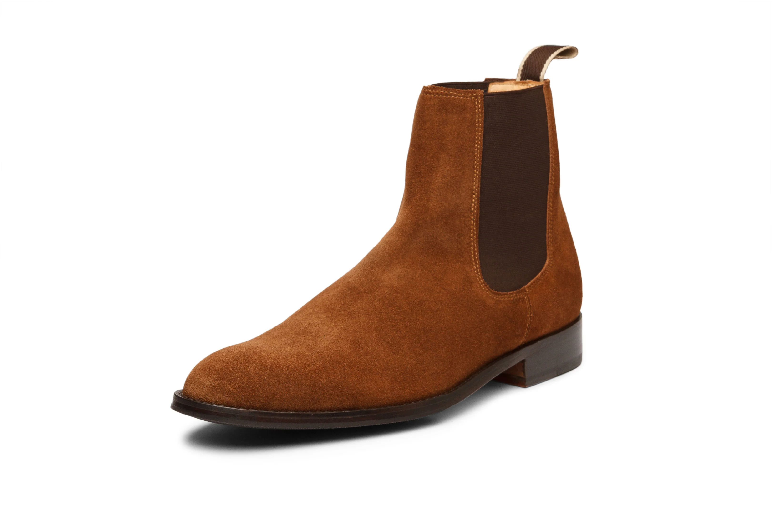 Leather Chelsea Boot features Hand Built Argentinean Leather Sole with Rubber Forepart, Dark Cognac Suede Leather, and Rich Tan DD Lining.