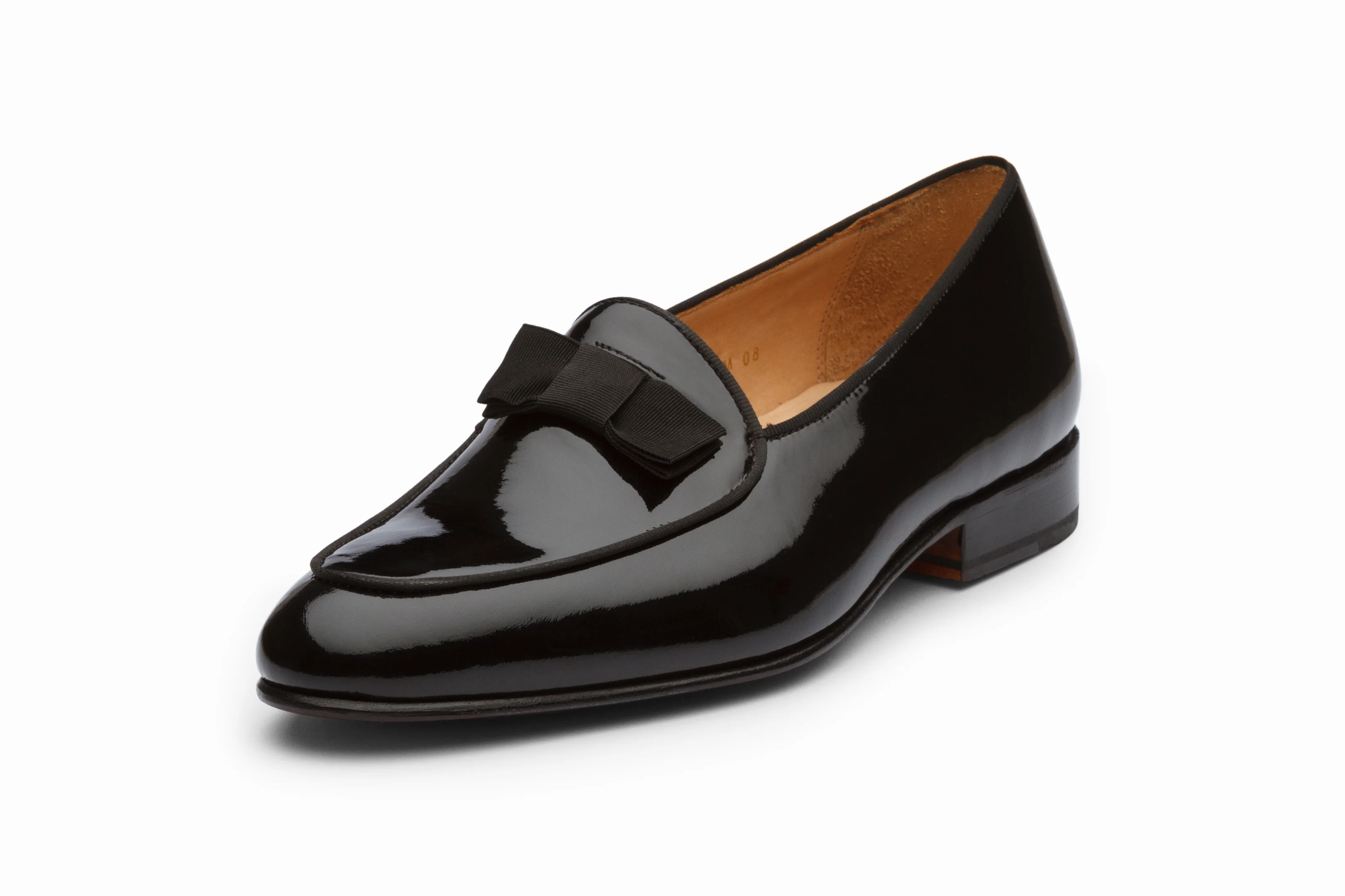 Opera Pumps with Grosgrain Bow features Hand Built Argentinean Leather Sole, Exquisitely detailed and Crafted in Black Patent Leather and Rich Tan Cow Leather Lining.