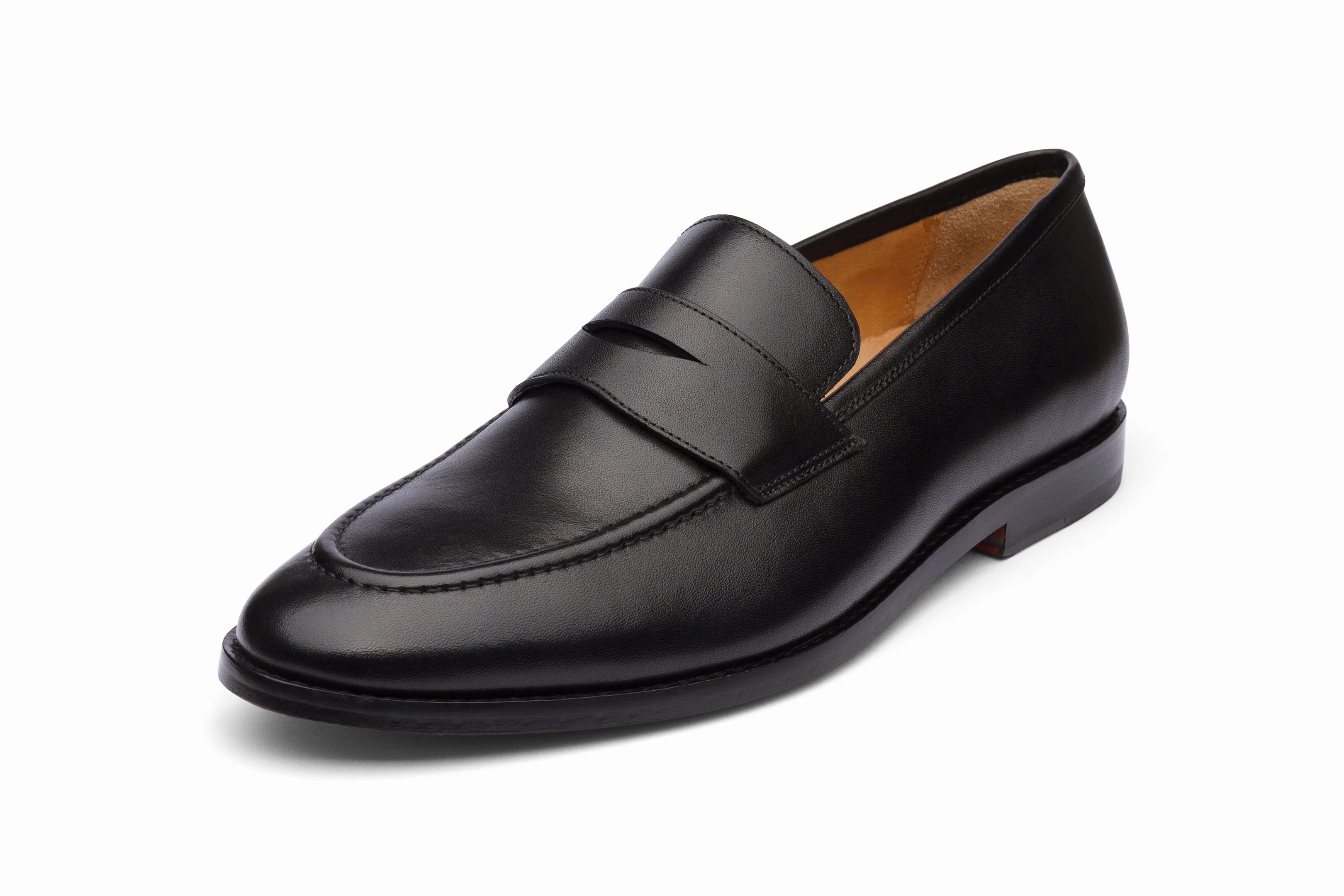 Penny Loafer features Hand Built Argentinean Leather Sole, Black Full Grain Calfskin Leather, Cord Stitch Detailing on Vamp and Rich Tan Cow Leather Lining.