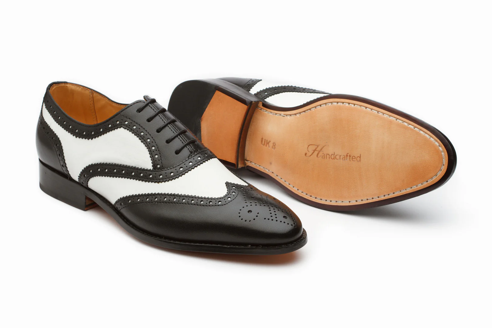 Classic Two-Tone Spectator Wingtips featuring Black Calfskin Leather and Contrasting White Crust Leather for a vintage style, Hand Built Argentinean Leather Sole, and Leather Lining.