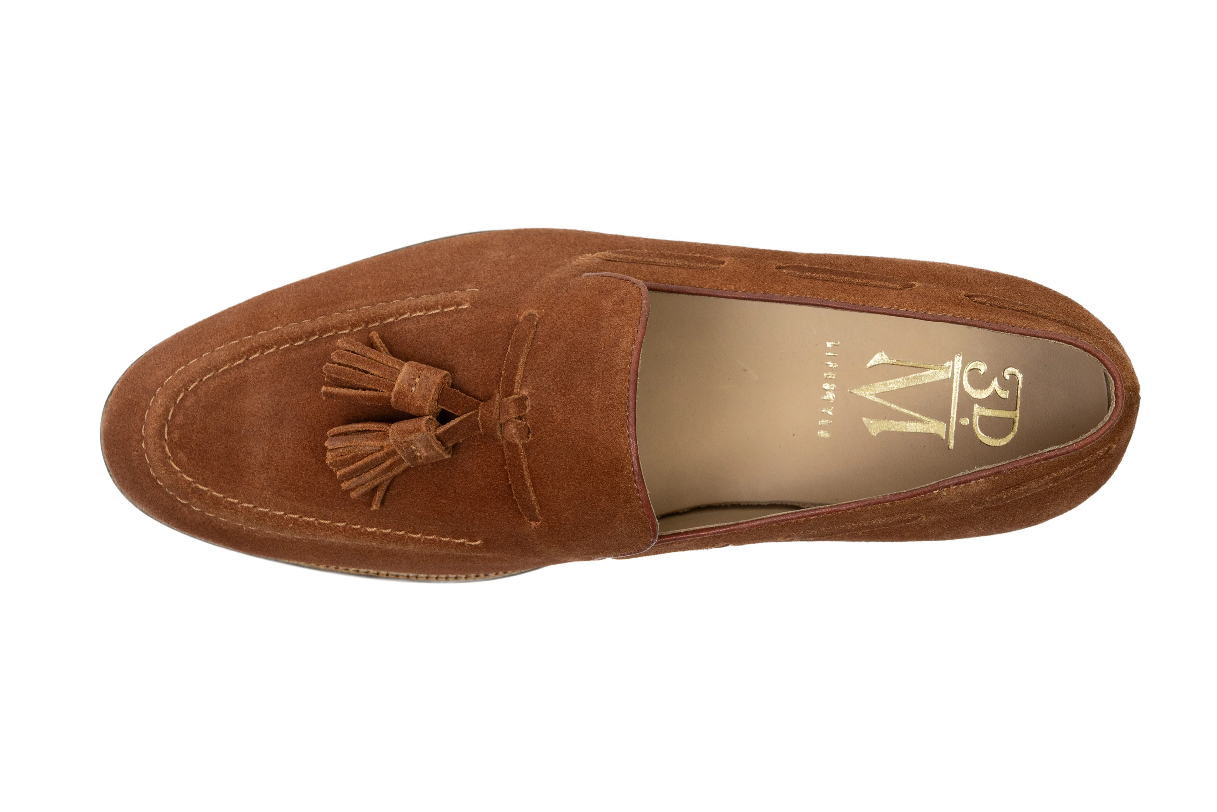 Tassel Loafer features Hand Built Argentinean Leather Sole, Copper Suede Calfskin Leather Uppers, and Rich Tan Cow Leather Lining.