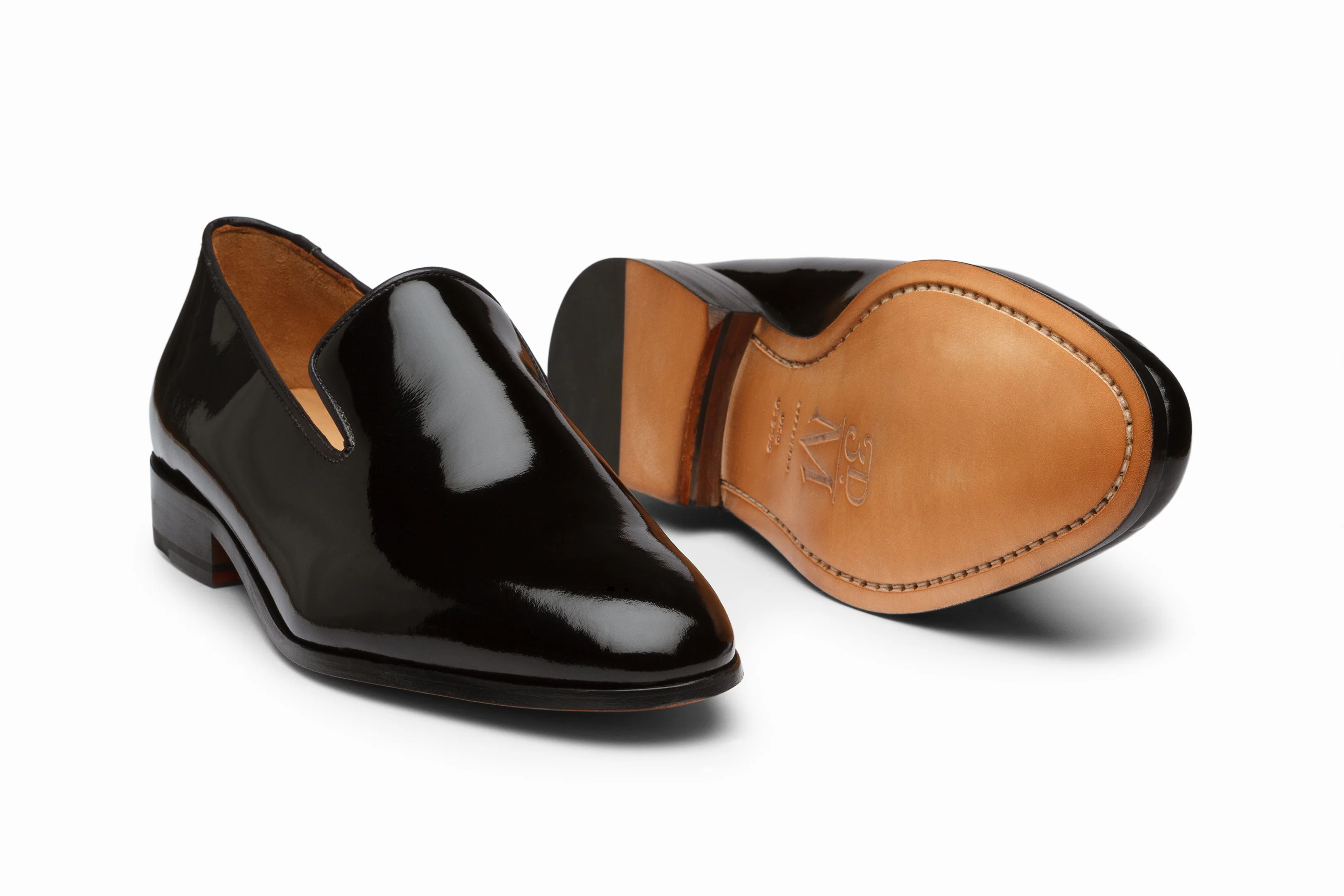 Venetian Loafer features Hand Built Argentinean Leather Sole, Black Patent Calf-skin Leather uppers, and Rich Tan Cow Leather Lining.