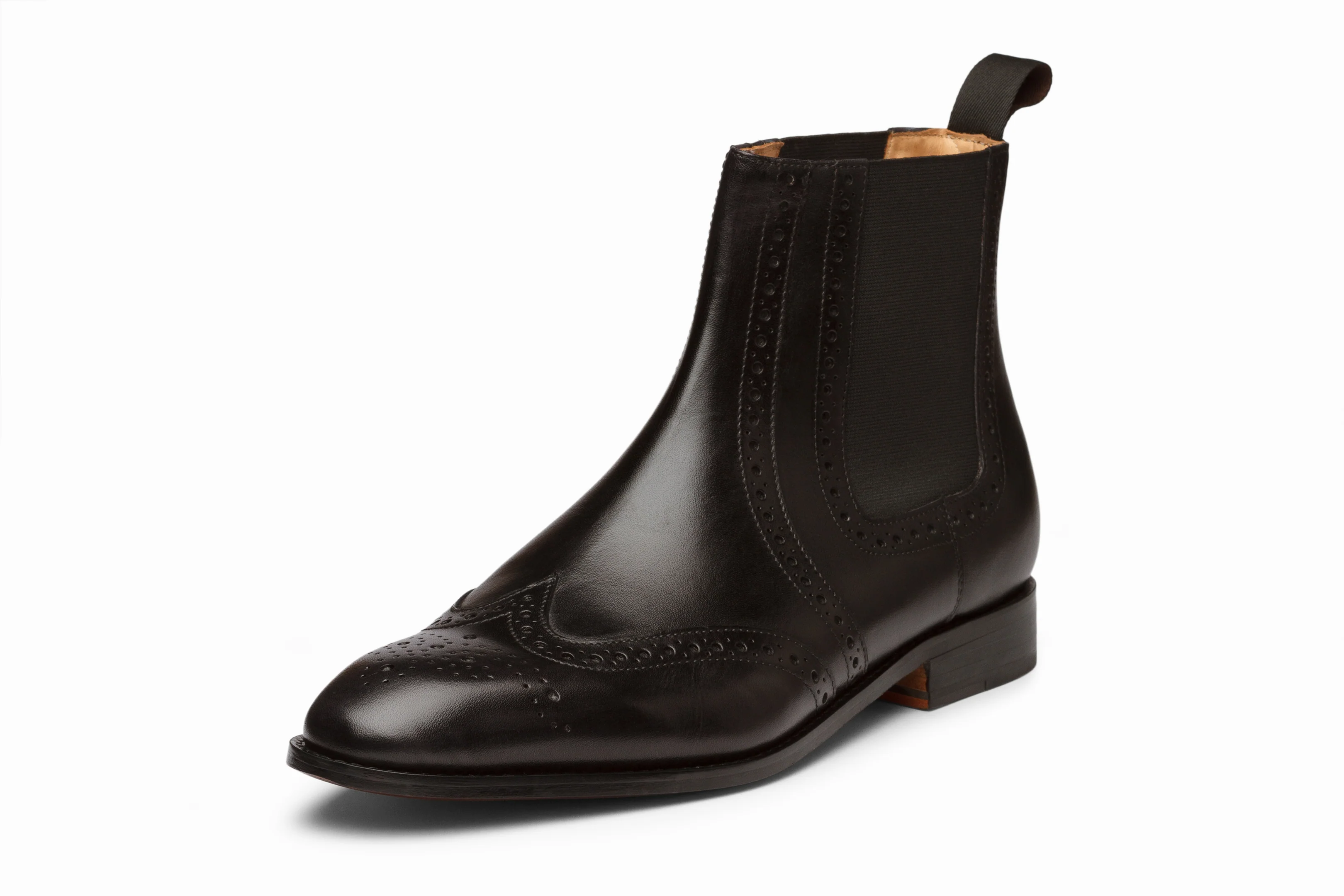 Leather Chelsea Boot features Hand Built Argentinean Leather Sole, Full Grain Black Calfskin Leather uppers with wingtip broguing, and Rich Tan DD Lining.